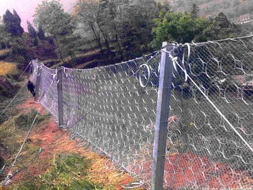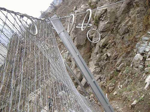 被動防護(hù)網(wǎng)由鋼絲繩網(wǎng)或環(huán)形網(wǎng)(需攔截小塊落石時附加一層鐵絲格柵),固定系統(tǒng)(錨桿、攔錨繩、基座和支撐繩)、減壓環(huán)和鋼柱四個主要部分構(gòu)成。鋼柱和鋼絲繩網(wǎng)連接組合構(gòu)成一個整體,對所防護(hù)的區(qū)域形成面防護(hù),從而阻止崩塌巖石土體的下墜,起到邊坡防護(hù)作用。